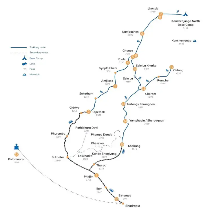 The trek generally starts from Taplejung, reached by a flight to Bhadrapur or Suketar, and includes visits to both North and South Base Camps of Kangchenjunga.