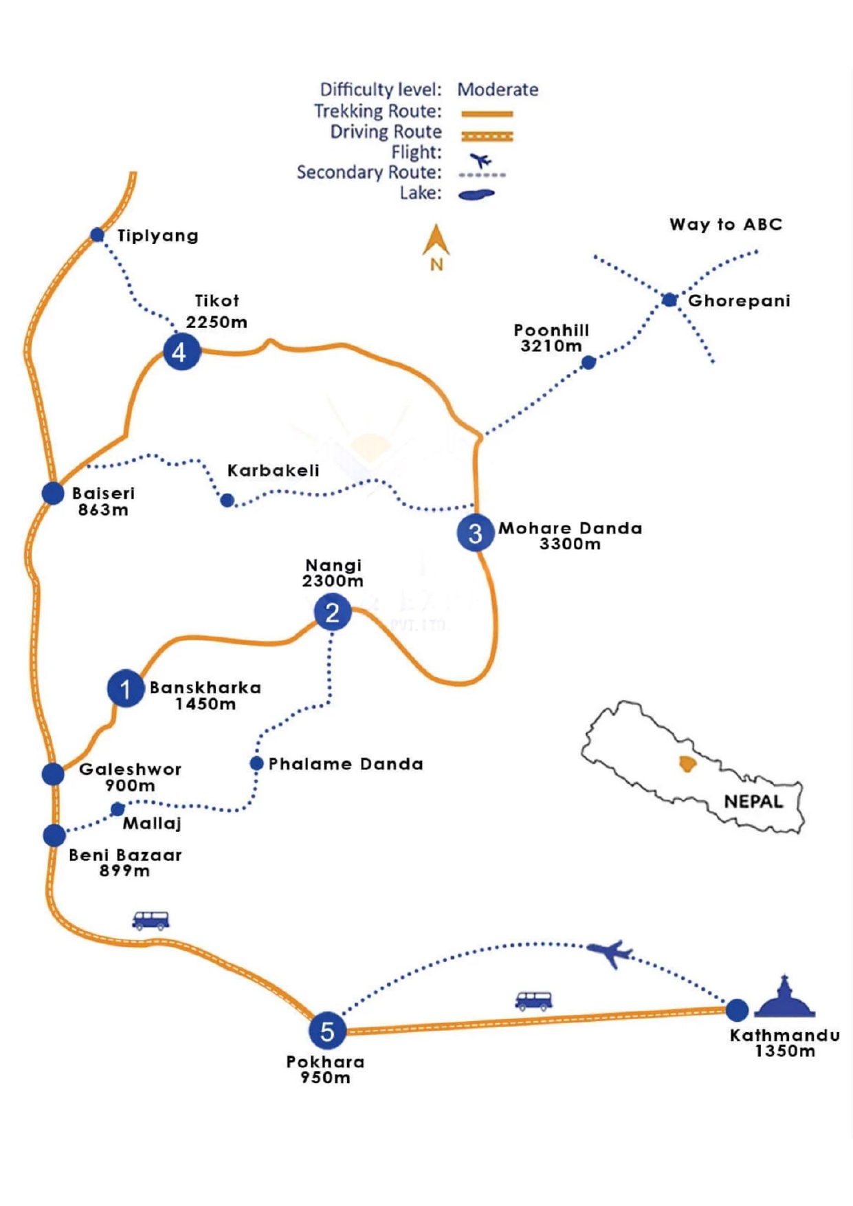 This is the last day of your Mohare Danda Trek. So after breakfast, you will start the trek from Tikot, the trail goes downhill to Tipling with remarkable sheer views down to the Kali Gandaki river underneath. After two hours downhill walk we get in Tipling at Kaligandaki corridor High way. Drive back to Pokhara by bus/Taxi taking 3 to 4 hours. Then your own Destination.