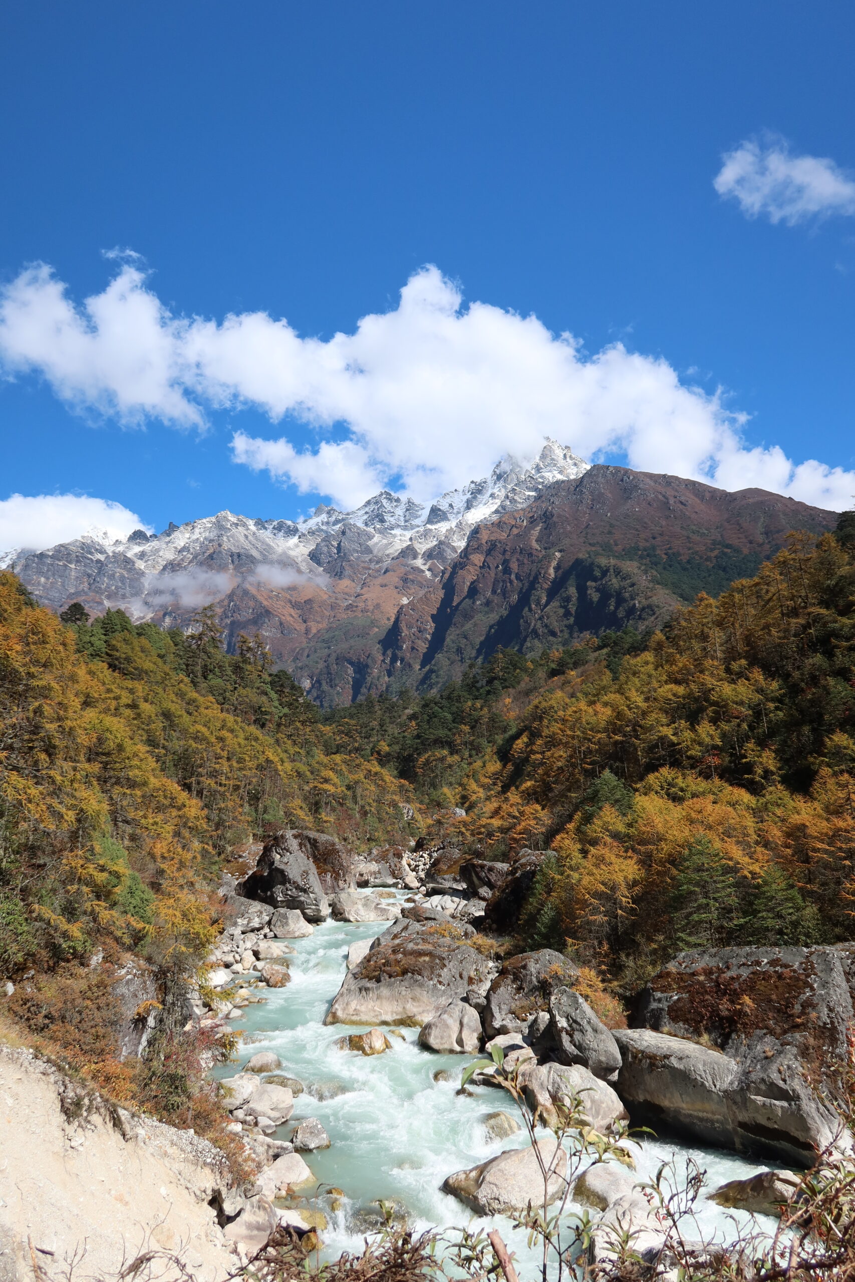The trek starts from Suketham village at 1,600 m and goes all the way up to 5,160 m, the highest point of the trek. We can see different stages of vegetation along the route. Since it was October, people living below 2,500 m were harvesting large amounts of cardamom. According to local people, they sell this raw product to India, and at present, it is one of the major sources of income for people living in this region.As we move upward, vegetation changes after 3,000 m. Different flora and fauna appear, and the dense forest gradually becomes thinner. People living at higher altitudes mainly grow potatoes and maize, but these crops cannot be grown above 3,400 m.The Tamor River can be seen all the way up to Khambachen, which is extremely beautiful, clean, and serene